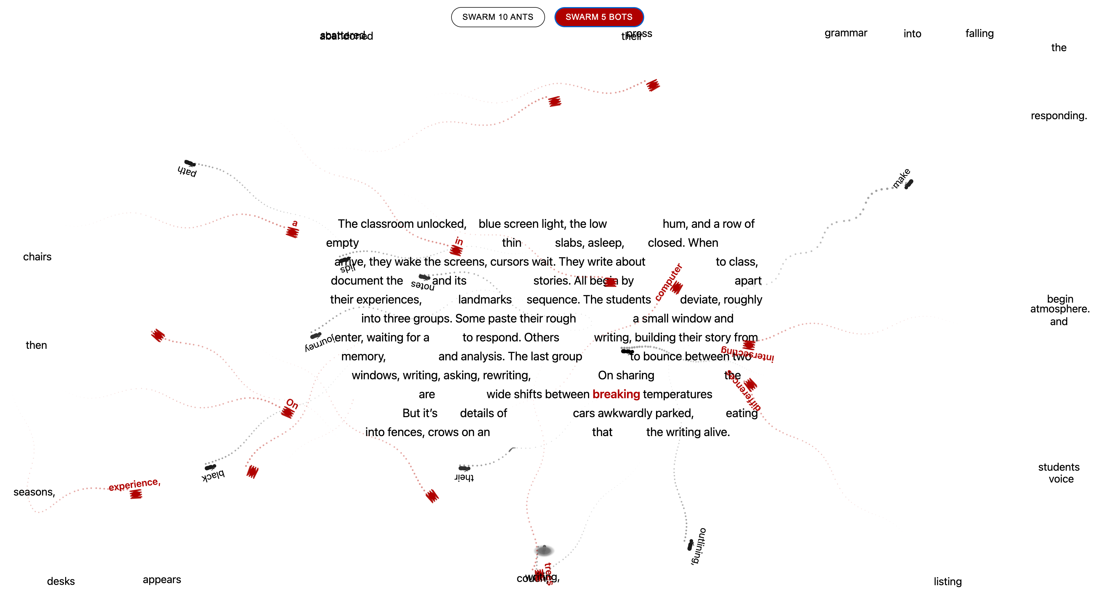 Description: Teaching digital writing is often as re-combinatory and non-linear and multi-modal as the digital works themselves. Swarm Rhetoric emulates this experience through swarms of creatures that pull apart and then rethink and rebuild a short-short story about the creative writing classroom. Ants, when swarming, remove texts and carry them to the screen’s edges. Robots, when swarming, carry those texts back to the story, depositing them in new places, reforming the story into poetry.