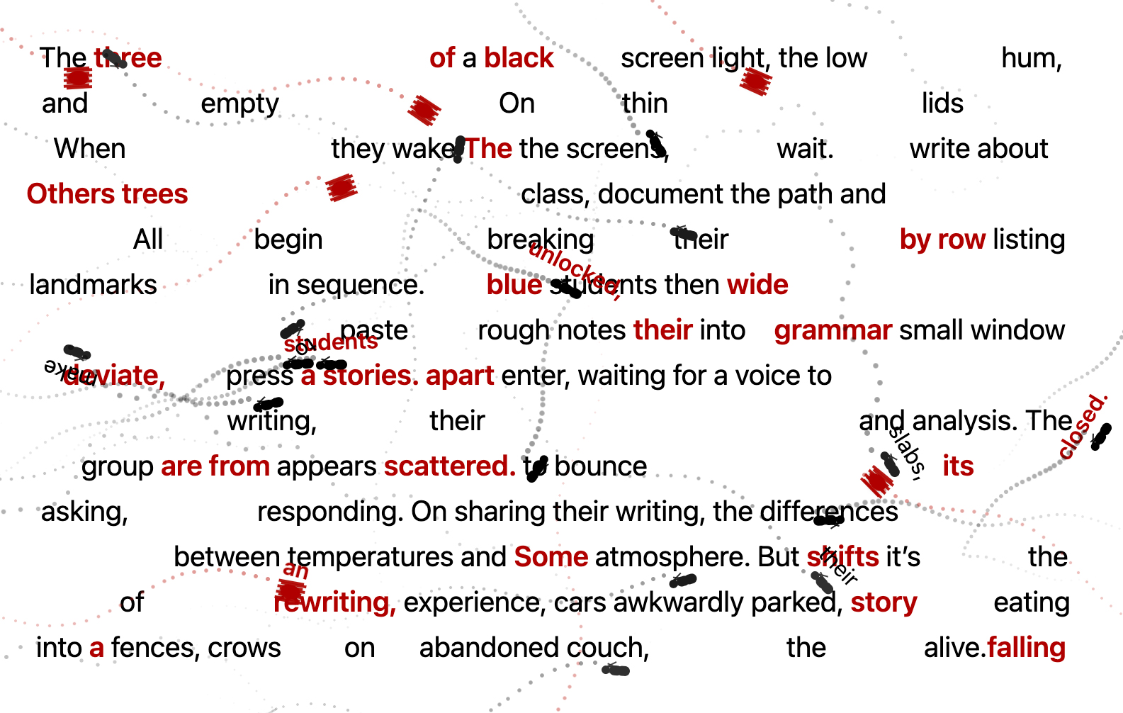 The classroom unlocked, a blue screen light, the low computer hum, and a row of empty chairs scattered. On desks thin black slabs, asleep, lids closed. When students arrive, they wake the screens, cursors wait. They write about their journey to class, document the path and its intersecting stories. All begin by outlining, breaking apart their experiences, listing landmarks in sequence. The students then deviate, roughly falling into three groups. Some paste their rough notes into a small window and press enter, waiting for a voice to respond. Others begin writing, building their story from memory, grammar and analysis. The last group appears to bounce between two windows, writing, asking, rewriting, responding. On sharing their writing, the differences are seasons, wide shifts between temperatures and atmosphere. But it’s the details of experience, cars awkwardly parked, trees eating into fences, crows on an abandoned couch, that make the writing alive.